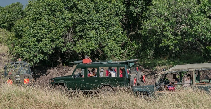 What outed her was the carcass of an animal she had killed the night before. It was in the high grass near the tree where the other drivers said she was hidden. You can see our approach to the area in the image above with the safari vehicles around a tree.